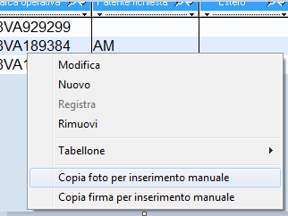 Nel caso di trasmissione delle pratiche in modalità manuale, è possibile copiare e incollare la foto e la firma delle pratiche da trasmettere. Per fare questo occorre cliccare sul tabellone delle pratiche da trasmettere con il tasto destro e, nel menu che appare in video, scegliere le funzioni "Copia foto per inserimento manuale" e/o "Copia firma per inserimento manuale".