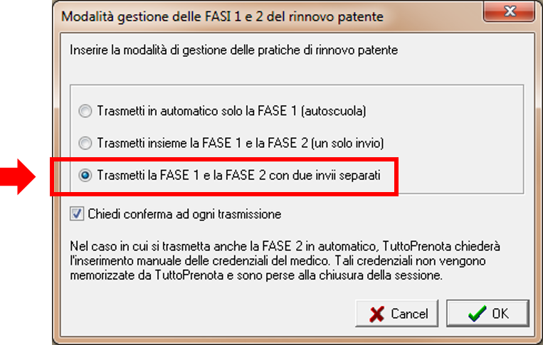 - durante la trasmissione della pratica il programma presenta la maschera sotto riportata dalla quale dovrete selezionare l'opzione visualizzata in figura (sia per la trasmissione della I che della II fase, la voce che dovete selezionare è sempre quella mostrata in figura):