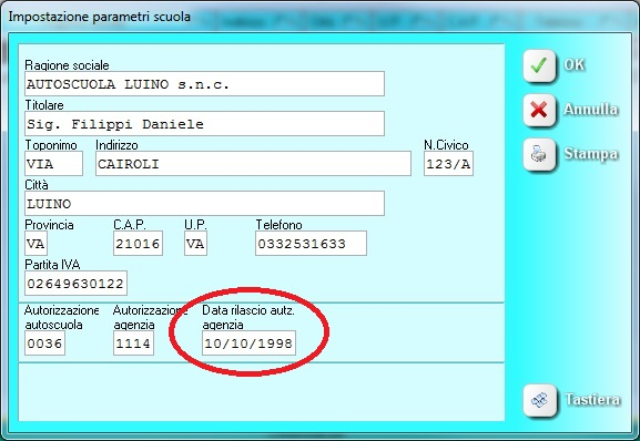 Andiamo su Imposta> Autoscuola e facciamo doppio clic sul nome della nostra agenzia. Si aprirà la maschera qui sotto nella quale dovremo inserire la data di rilascio dell’autorizzazione agenzia. La data verrà stampata sul Registro nella prima pagina.