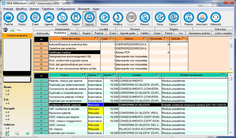 Per stampare invece un nuovo modulo si deve andare su una pratica di Conferma validità, cliccare sul tasto destro del mouse, cliccare sulla voce Stampe e poi Certificato medico.