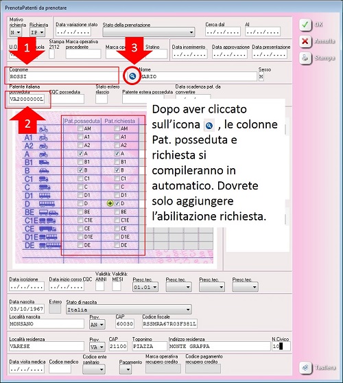 L'Autoscuola si troverà quindi la colonna delle patenti possedute già compilata e quella delle patenti richieste spuntabile SOLO per l'abilitazione richiesta in quel momento dal cliente. Ricordiamo comunque sempre di controllare e verificare la compilazione automatica delle patenti possedute, visto che gli archivi del CED potrebbero non essere aggiornati perfettamente.