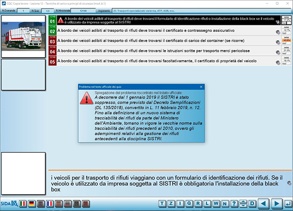 I quiz relativi alla CQC non sono stati modificati dal Ministero. Nel frattempo tuttavia le modifiche normative rendono alcuni quiz non più attuali o non più completamente corretti. In particolare, a partire dal primo gennaio 2019 il SISTRI è stato soppresso, così come previsto dal Decreto Semplificazioni (D.L.135/2018), convertito in L. 11 febbraio 2019, n. 12. Fino alla definizione di un nuovo sistema di tracciabilità dei rifiuti da parte del Ministero dell'Ambiente, tornano in vigore le vecchie norme sulla tracciabilità dei rifiuti precedenti al 2010, ovvero gli adempimenti relativi alla gestione dei rifiuti antecedente alla disciplina SISTRI.