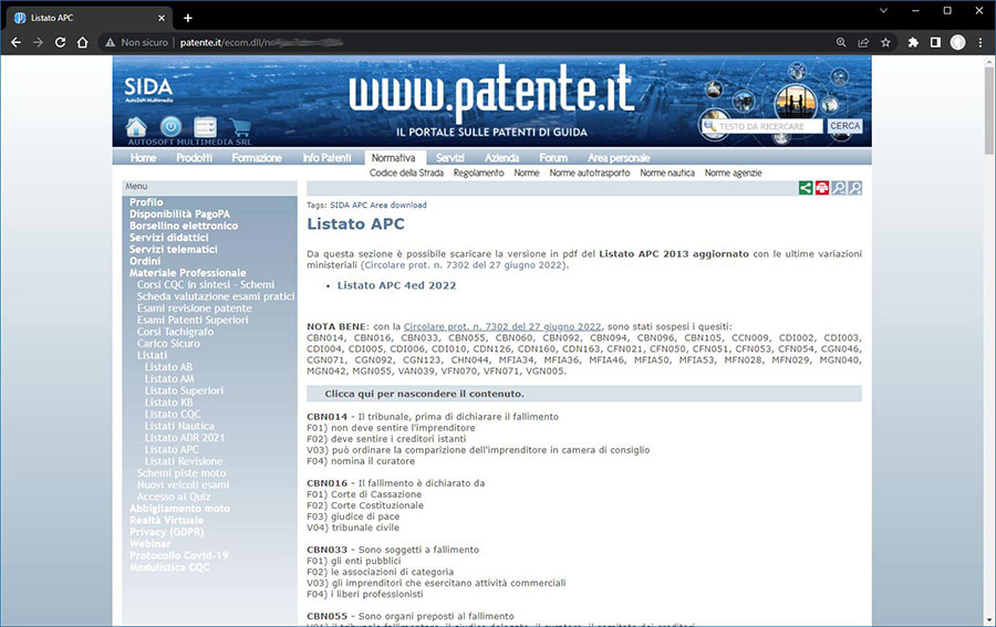 Il modulo Quiz di SIDA, SIDA QuizAPP APC e PATENTEONLINE sono aggiornati con la nuova versione del listato ministeriale APC.
