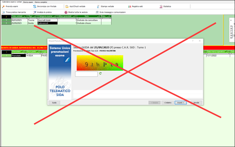 - Prenotazione esami - Captcha: quando si clicca su "Esami --> Prenota esami" e si selezionano dei candidati da prenotare, al termine dell'operazione non comparirà più la finestra con l'inserimento del codice Captcha, il quale verrà inserito direttamente dal gestionale rendendo l'operazione più semplice e veloce.