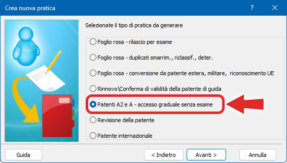 Al momento è possibile creare la pratica "Patenti A2 e A - accesso graduale senza esame" e gestire la prima e seconda fase dal gestionale; il resto della procedura va effettuato dal Portale.
