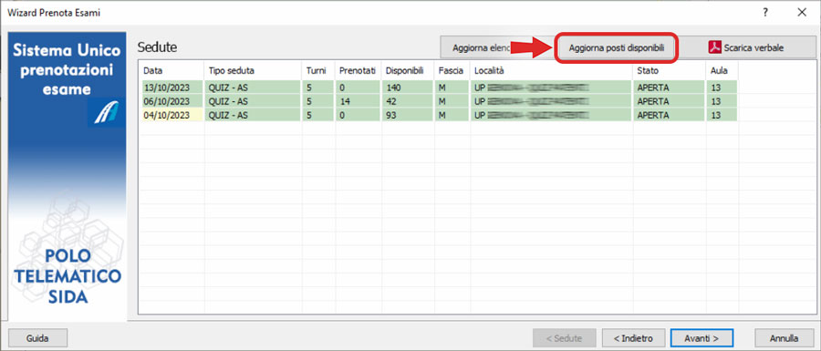 Per chi possiede più sedi troverà la solita schermata da cui scegliere la sede desiderata. - Prenotazione esami - Aggiornamento posti disponibili: alla voce di menù "Esami --> Prenota esami" nella schermata con l'elenco delle sedute se si clicca su "Aggiorna posti disponibili" vengono aggiornate anche le sedute con posti disponibili pari a zero. In questo modo sarà possibile vedere se si liberano posti prima dell'esame.
