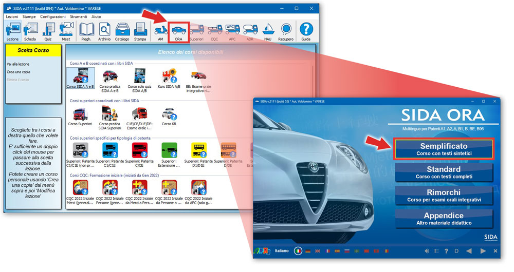 • installare gratuitamente il software SIDA ORA che contiene il corso A e B tradotto in 10 lingue (italiano, inglese, tedesco, francese, arabo, cinese, russo, spagnolo, albanese e romeno);