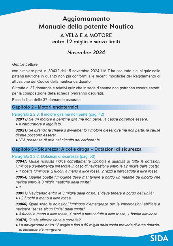 Con circolare prot. n. 30432 del 15 novembre 2024 il MIT ha oscurato alcuni quiz delle patenti nautiche in quanto non più conformi alle recenti modifiche del Regolamento di attuazione del Codice della nautica da diporto.
