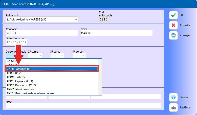 Come di consueto, il candidato verrà registrato in archivio anagrafico e gli verrà assegnato un codice da utilizzare per le esercitazioni con il modulo quiz.